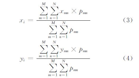 如圖2(b)所示,在經(jīng)過(guò)大津法處理后,各個(gè)燈點(diǎn)區(qū)域互不連通,又因?yàn)閱蝹€(gè)燈點(diǎn)區(qū)域近似為一圓形,且燈點(diǎn)的排列是有規(guī)則的,因此可把每一個(gè)LED燈點(diǎn)區(qū)域中心近似看作為燈點(diǎn)所在位置的中心點(diǎn)。本文采用一階矩質(zhì)心法(也稱作重心法)來(lái)確定各個(gè)燈點(diǎn)的中心位置,其計(jì)算表達(dá)式為