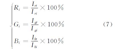 式中Ri、Gi、Bi分別為第i個(gè)燈點(diǎn)的紅色、綠色、藍(lán)色的校正系數(shù);Irt、Igt、Ibt為三色校正目標(biāo)值的相對(duì)亮度值;Iri、Igi、Ibi為第i個(gè)燈點(diǎn)三色相對(duì)亮度值。因此每個(gè)燈點(diǎn)所對(duì)應(yīng)的校正矩陣為[RiGiBi]T。
