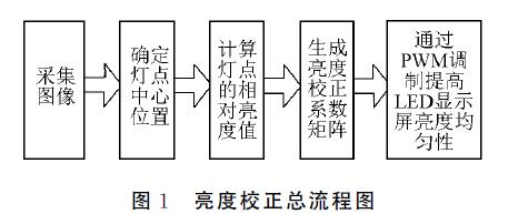 本文運(yùn)用數(shù)字圖像處理技術(shù)對(duì)顯示屏上每個(gè)燈點(diǎn)的相對(duì)亮度進(jìn)行檢測(cè)和提取,計(jì)算出各個(gè)燈點(diǎn)的校正系數(shù)矩陣,并運(yùn)用脈沖寬度調(diào)制(PWM)方法調(diào)節(jié)相應(yīng)燈點(diǎn)的亮度,從而提高全彩LED顯示屏的亮度均勻性。圖1為算法的總流程圖。