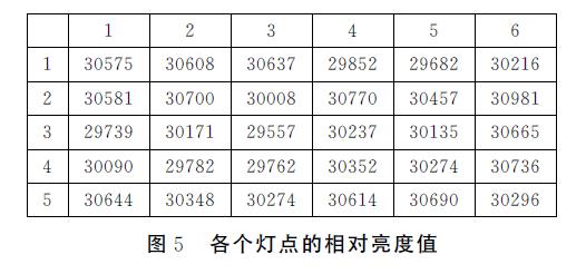 (2)以每個(gè)燈點(diǎn)的中心位置為中心,以操作距離為半徑作圓,如圖4所示,提取該圓形區(qū)域內(nèi)的各個(gè)像素的灰度值進(jìn)行求和。此灰度值的和即為該燈點(diǎn)的相對(duì)亮度值。在全部亮度提取完后保存為亮度數(shù)據(jù)文件,如圖5所示。
