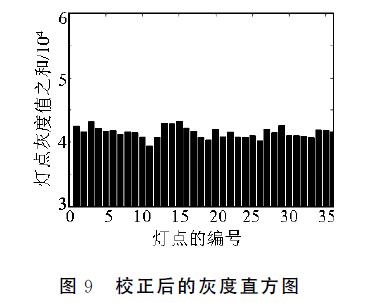 圖8和圖9分別為校正前和校正后各燈點(diǎn)的相對(duì)亮度值直方圖。通過(guò)比較可以看出,校正前直方圖數(shù)據(jù)的差異性比較大,而校正之后直方圖數(shù)據(jù)的差異相對(duì)比較小,在特殊的情況下,如果統(tǒng)計(jì)的數(shù)據(jù)不存在任何的差異,直方圖會(huì)呈現(xiàn)一條直線。從實(shí)驗(yàn)數(shù)據(jù)中可以發(fā)現(xiàn),在經(jīng)過(guò)亮度校正后,亮度均勻性得到了很好的改善。