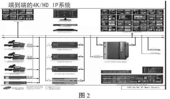 IP技術(shù)在廣電行業(yè)里面已經(jīng)應(yīng)用很久,什么樣的架構(gòu)才符合現(xiàn)在的行業(yè)需求?所有IT架構(gòu)里面較典型的數(shù)據(jù)中心的架構(gòu)是分層架構(gòu),有核心層、匯聚層、應(yīng)用層。其中核心和匯聚層沒(méi)有區(qū)別,真正跟業(yè)務(wù)相關(guān)的是應(yīng)用層。對(duì)此,草谷公司認(rèn)為首先不會(huì)改變IP化本身架構(gòu),不繼承傳統(tǒng)廣播電視單體設(shè)備化的方向,這樣就得到真正為廣播電視服務(wù)的數(shù)據(jù)中心?;谏鲜龈拍?草谷公司建立正式的4K/HD IP系統(tǒng)和傳統(tǒng)系統(tǒng)是不一樣的,不再是從左到右線性化圖。如圖2所示。