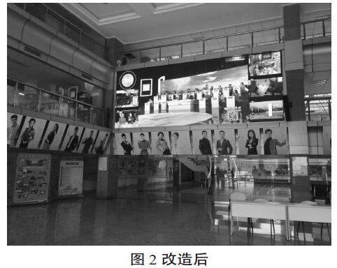 我臺(tái)原大堂中廳內(nèi)的LED顯示屏幕采用紅綠單色顯示屏幕,寬4米,高2.88米,主要作用是播放局臺(tái)各類(lèi)重要信息通知,播放只能通過(guò)文字形式,只能滿(mǎn)足日常管理方面的需求。經(jīng)過(guò)內(nèi)部技術(shù)委員會(huì)的多次論證,改造后的屏幕面積必須增加,分辨率必須達(dá)到高清分辨率以上。經(jīng)過(guò)設(shè)計(jì)新裝屏幕,寬7.87米,高2.88米,完全填充中廳內(nèi)的兩個(gè)大柱子。屏幕采用3mm表貼三合一黑燈黑面罩屏幕,燈芯采用臺(tái)灣晶元光電Epista) ,分辨率2624x 960顯示,圖像比例為16:6, 像素分辨率很過(guò)2K,已經(jīng)達(dá)到高清顯示要求。(圖2)
