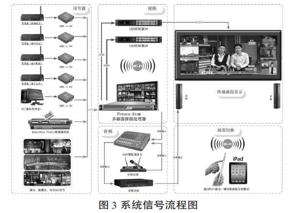 電視臺(tái)主要以拍攝和播出視頻節(jié)目為主,我臺(tái)現(xiàn)有記者采訪設(shè)備及編輯設(shè)備已經(jīng)達(dá)到高清化制作水平,部分精品類(lèi)的晚會(huì)、專(zhuān)題片、微電影已經(jīng)實(shí)現(xiàn)高清、2K、4K制作,但是目前我臺(tái)播出的節(jié)目仍舊以標(biāo)清播出為主。系統(tǒng)設(shè)計(jì)之初,在滿(mǎn)足現(xiàn)有標(biāo)清播出的前提下,考慮到日后高清化播出要求,大屏幕播出信號(hào)必須兼容高清。由于采用P3的屏幕,物理分辨率已經(jīng)很過(guò)高清,系統(tǒng)需采用兩套LED控制處理器進(jìn)行拼接,然后把圖像信號(hào)轉(zhuǎn)換成網(wǎng)絡(luò)信號(hào)傳送給屏幕。由于輸入信號(hào)源較多(表 1),系統(tǒng)采用多大洋Fresco-Atom矩陣式畫(huà)面分割處理器,分別輸出兩路拼接后的HDMI信號(hào)給到LED控制器,該處理器較大支持拼:接成4K分辨率3840x2160顯示。另外,PC端遙控面板不僅可以對(duì)16x2矩陣進(jìn)行控制,還可對(duì)多畫(huà)面布局進(jìn)行快速切換,并且可以將任意輸入信號(hào)瞬間切換至全屏或“主窗口”顯示。支持信號(hào)任意拼接任意縮放、任意復(fù)制、任意位置布局等。同時(shí),系統(tǒng)可通過(guò)WIFI路由器組成無(wú)線網(wǎng)絡(luò),支持iPad控制,方便其他外來(lái)單位來(lái)我臺(tái)參觀學(xué)習(xí)時(shí),講解人員可以在大堂中廳,通過(guò)iPad遠(yuǎn)程遙控畫(huà)面。