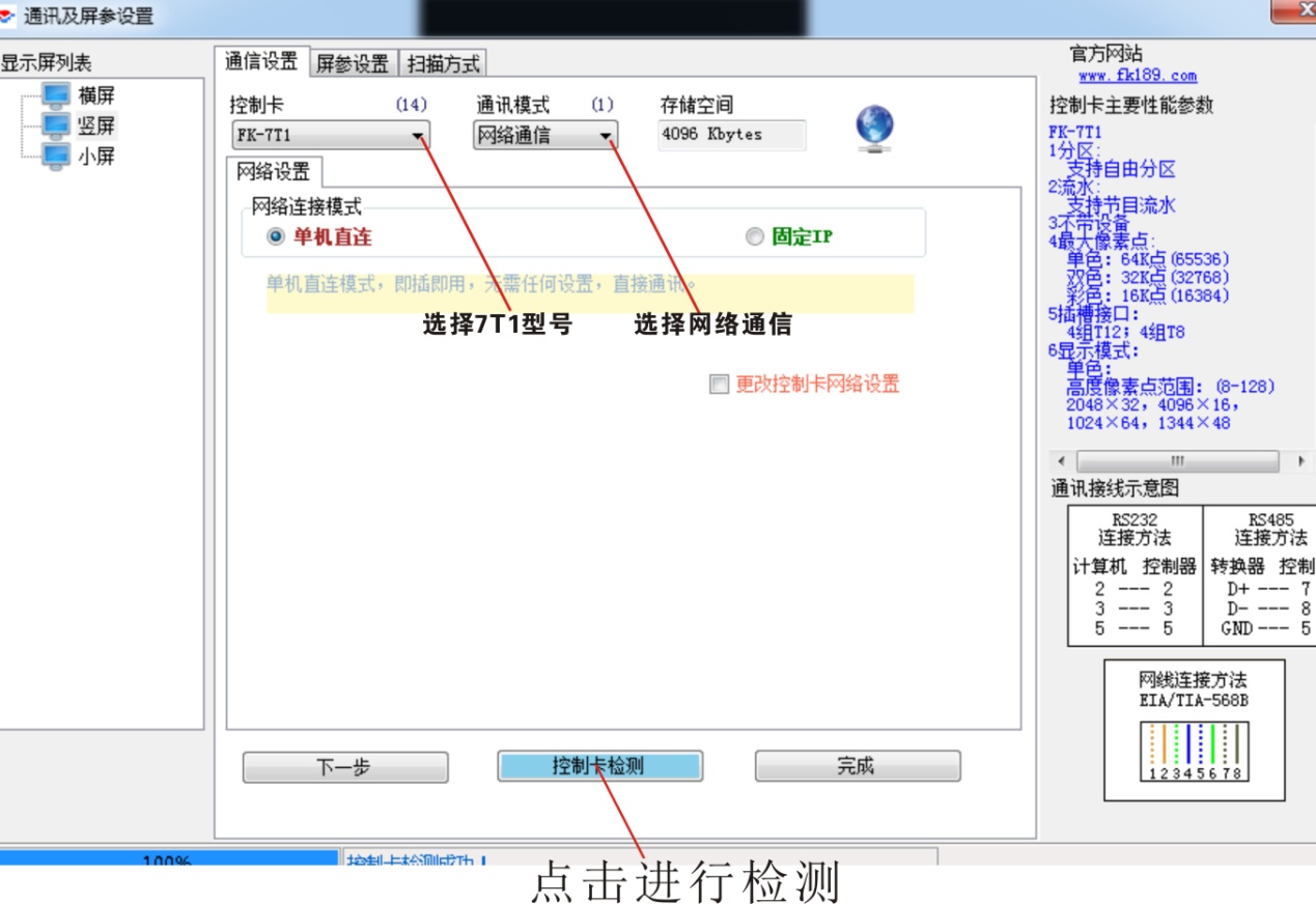 (1)通訊設(shè)備,控制卡選擇本屏的FK-7T1,通訊模式選擇網(wǎng)口,再點下面控制卡檢測。