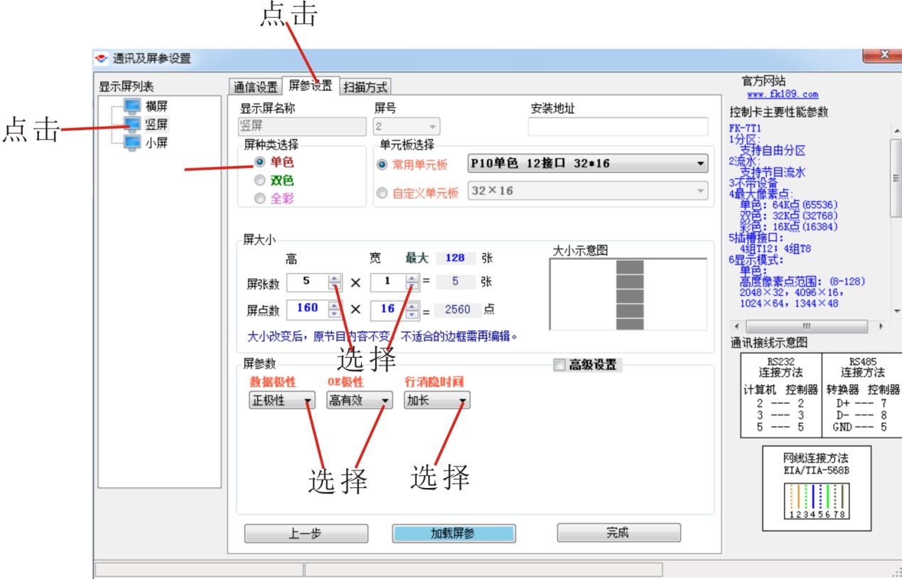 (2)點較上面屏參設(shè)置,根據(jù)本屏選擇單色,豎屏,將屏寬、屏高通過小箭頭調(diào)成5和1,數(shù)據(jù)很性:正,OE很性:正,消隱時間:加長,然后點加載屏參。成功后點完成。